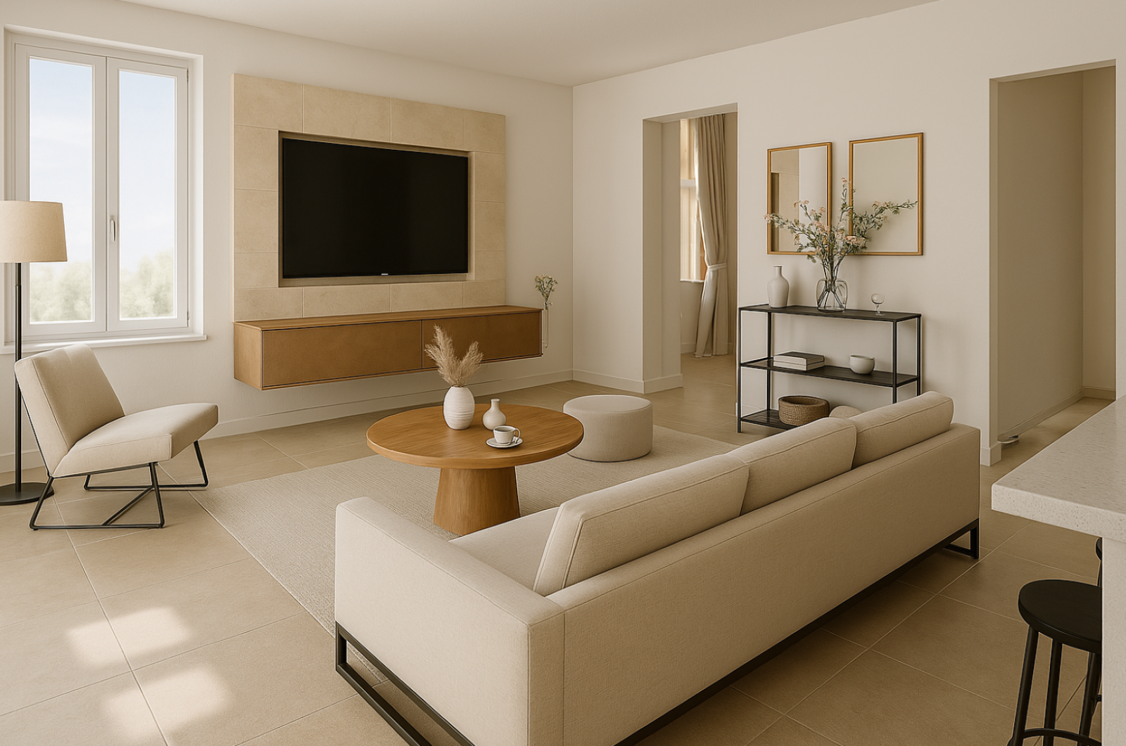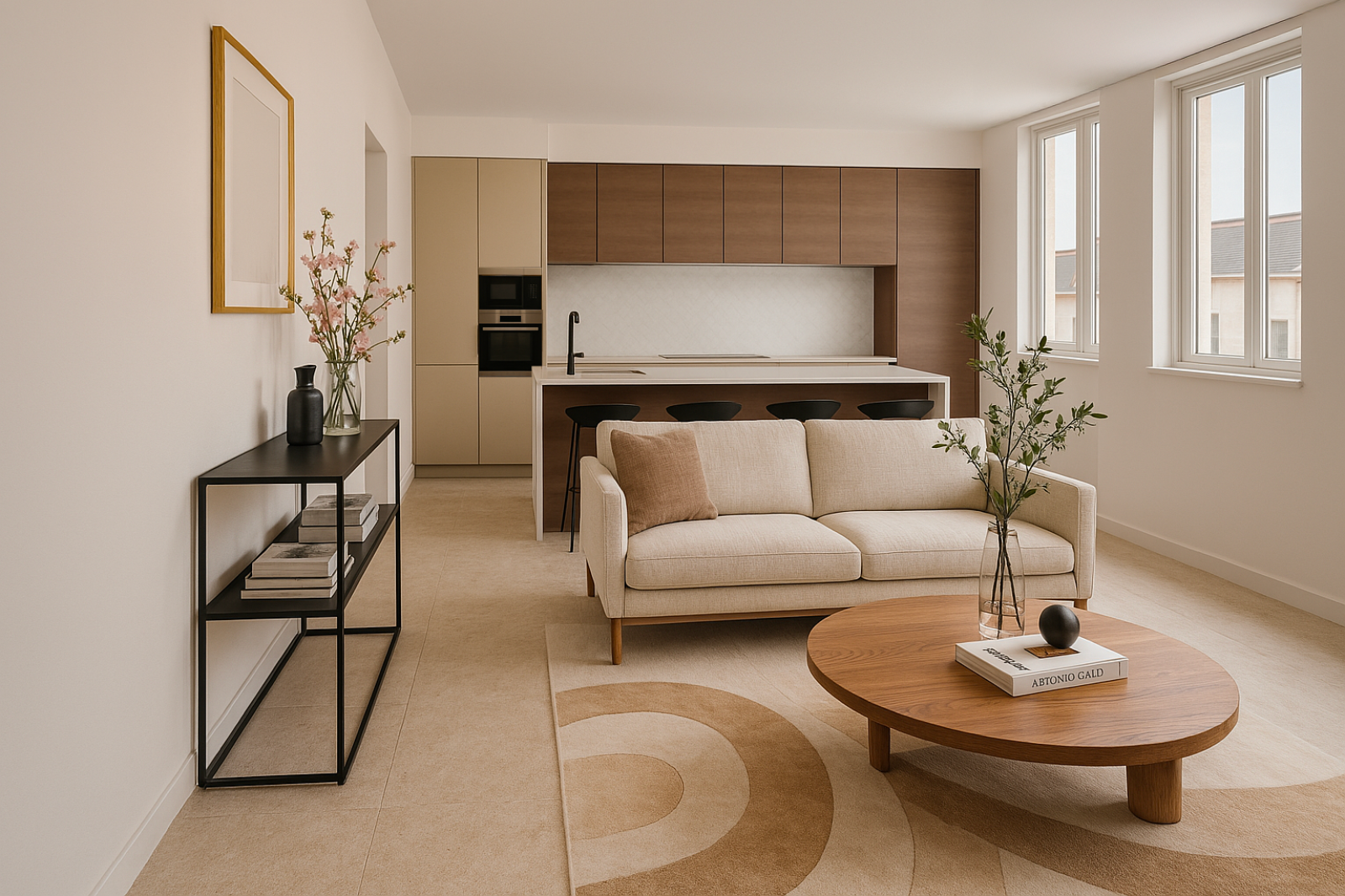 Un salon, une cuisine aménagée et entièrement équipée avec îlot central, deux chambres, une salle d'eau et un WC.
