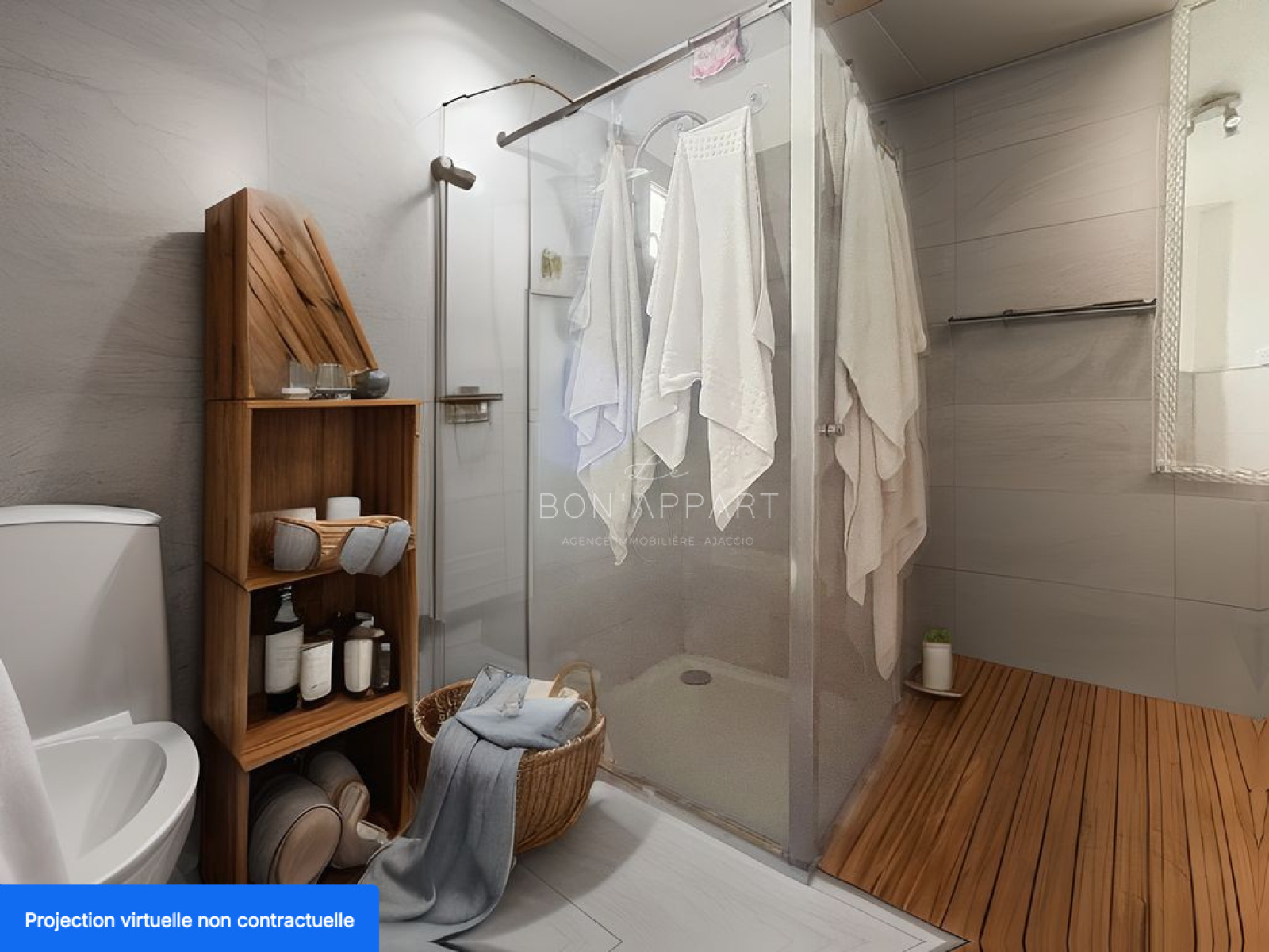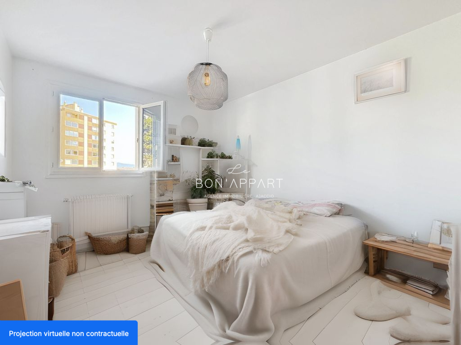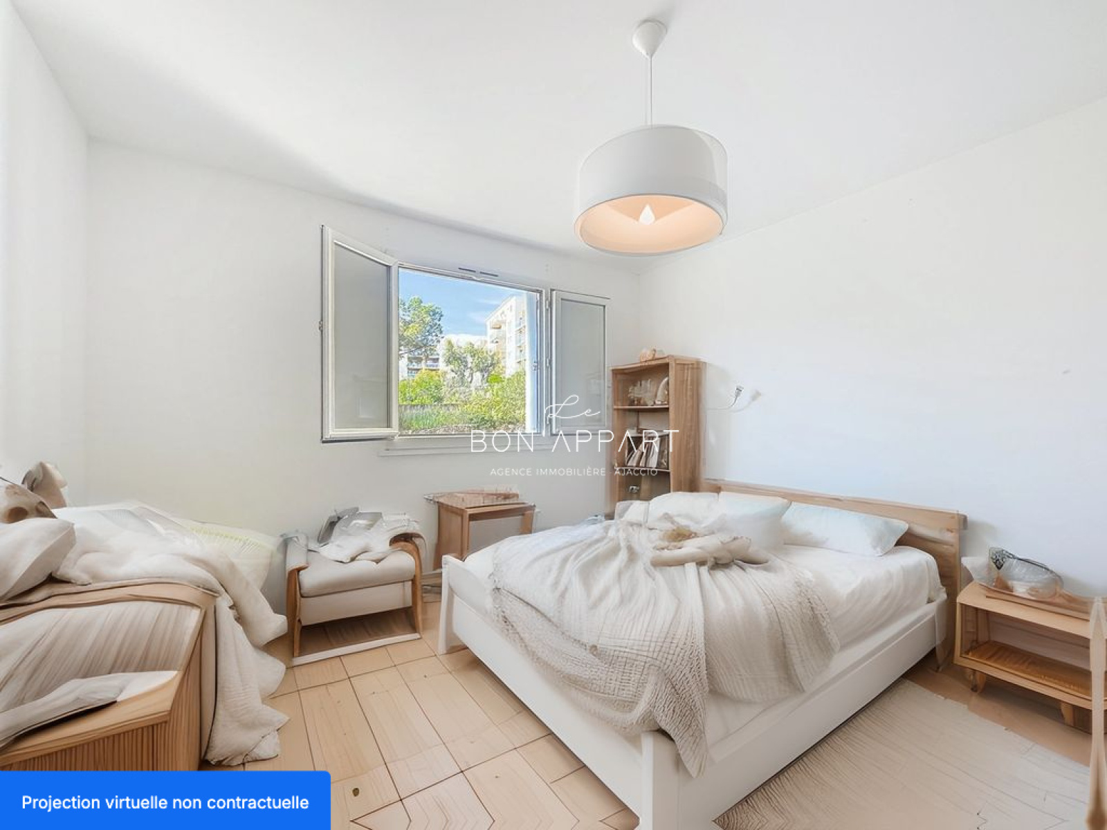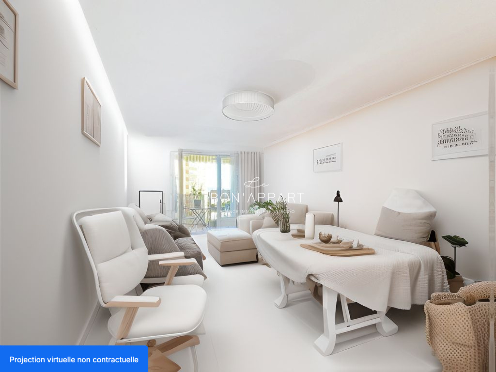 Les photos accompagnées de la mention "projection virtuelle non contractuelle" ont été générées par intelligence artificielle afin de vous donner une idée du potentiel de l’appartement après travaux de rafraîchissement.